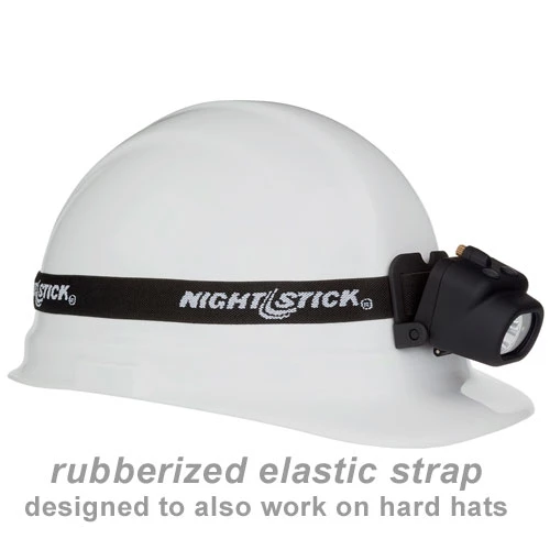 • non-slip elastic headband with rubberized backing also works on helmets and hard hats