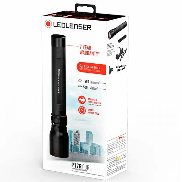Whatโs included: LEDLenser P17R Core flashlight with rechargeable battery, mounting bracket, magnetic charge cord with AC-wall plug, belt clip